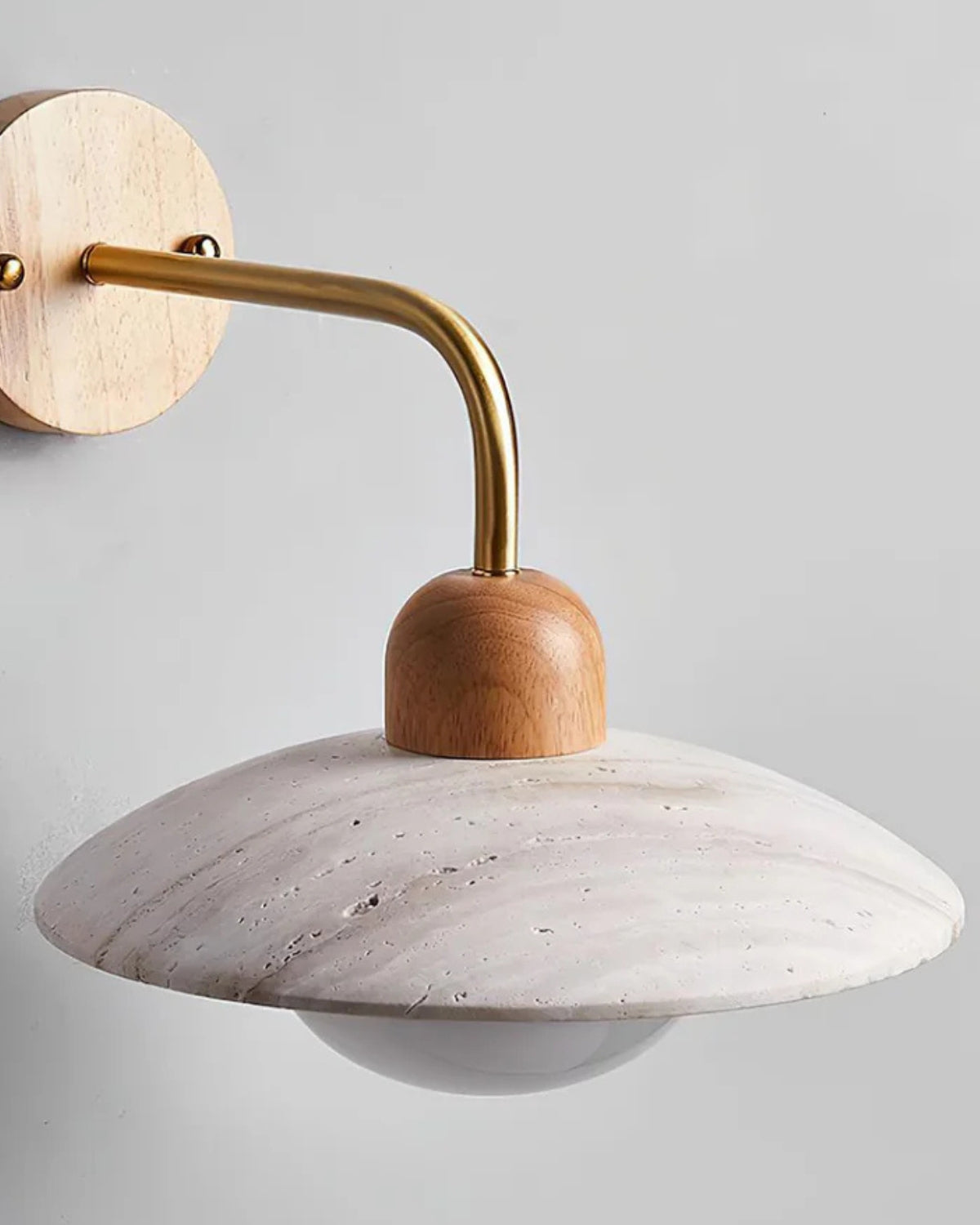 Erhöhen Sie Ihren Raum mit La Lueur Divineeine harmonische Mischung aus natürlicher Eleganz und modernem Design. Diese exquisite Wandleuchte verfügt über einen wunderschönen, breitkrempigen Schirm aus gesprenkeltem gelbem Travertin, der eine taktile und visuell fesselnde Textur bietet. Der warme, natürliche Holzakzent an der Basis des Schirms passt perfekt zu dem eleganten, gebürsteten Messingarm, der sich mühelos von einer minimalistischen hölzernen Wandhalterung biegt. Dieses Design ist eine perfekte Verschmelzung von organischer Schönheit und raffinierter Raffinesse.