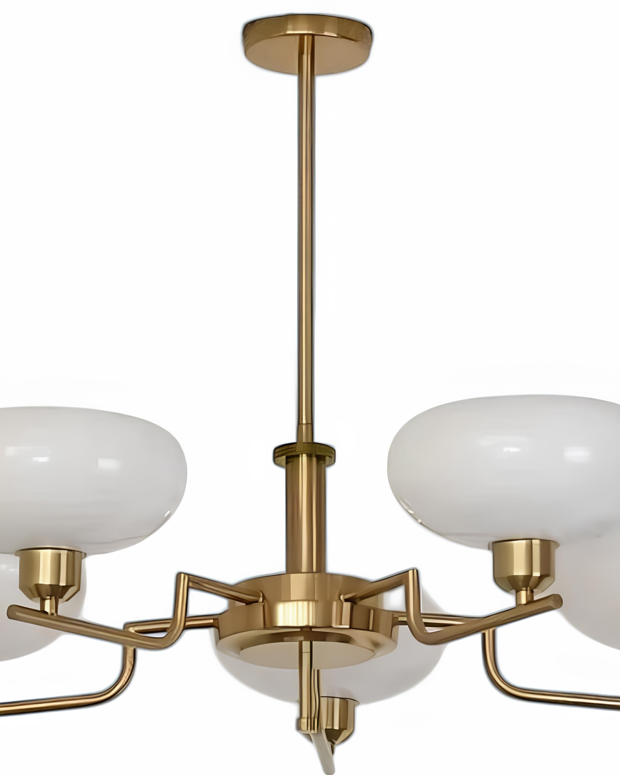 Verleihen Sie Ihrem Interieur zeitlose Eleganz mit Le Lustre Moderne - einer Deckenleuchte, die Bauhaus-Design aus der Mitte des Jahrhunderts mit moderner Raffinesse verbindet. Mit seinen sanft geschwungenen Armen, mattierten Glasschirmen und einer hochwertigen Metalloberfläche in Messing oder Chrom ist dieser Kronleuchter sowohl ein Kunstwerk als auch eine funktionale Leuchte.