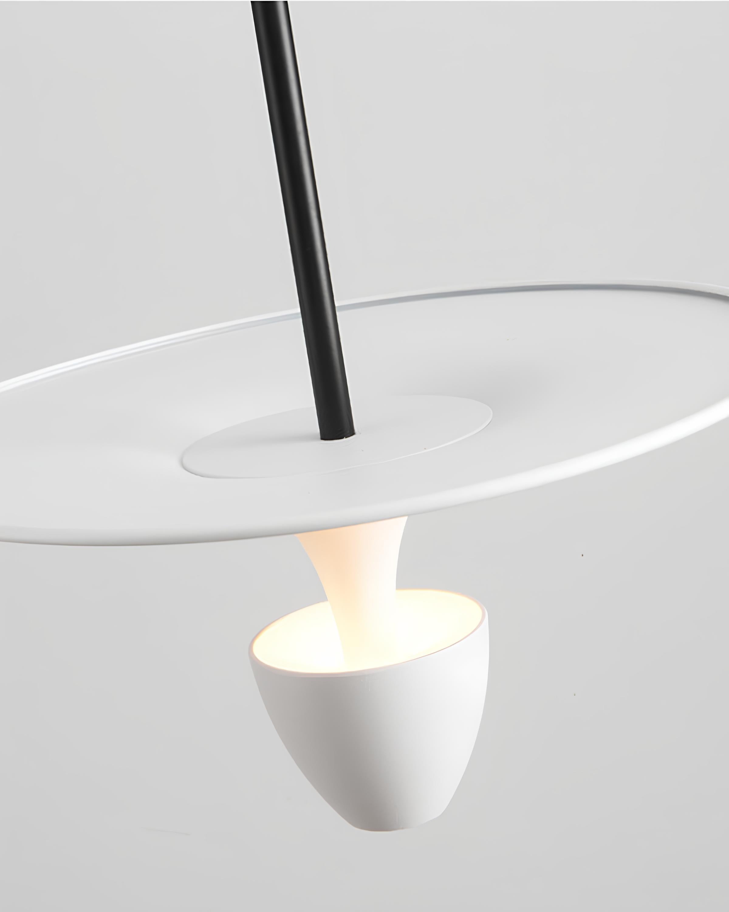 The design is marked by its seamless interplay of shapes: a gently flared white shade that diffuses light beautifully, suspended above a distinctive base in deep wood or minimalist matte white. This unique geometry not only adds visual intrigue but enhances the atmosphere with warm, layered light.