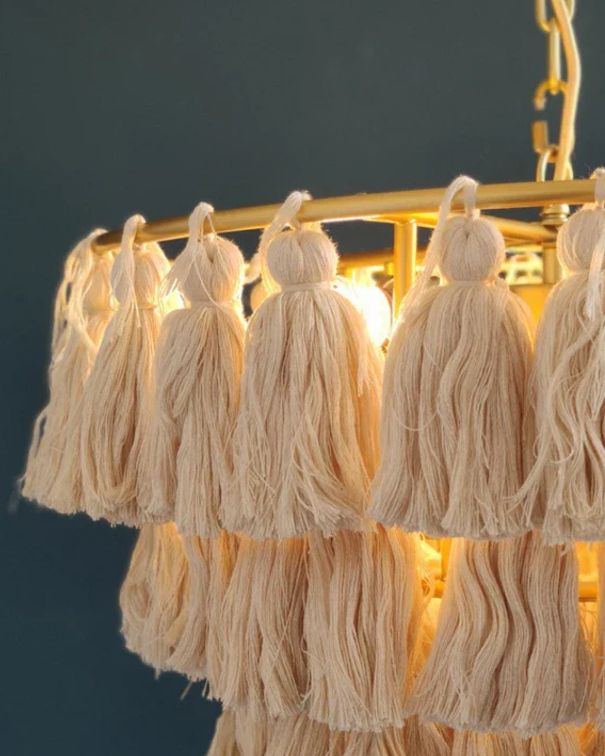 With cascading tiers of delicately knotted tassels and a solid brass-finished frame, this light fixture is more than just functional—it’s a statement of refined boho artistry. Whether gracing a dining space, bedroom, or creative corner, it transforms ordinary rooms into poetic sanctuaries of light and texture.