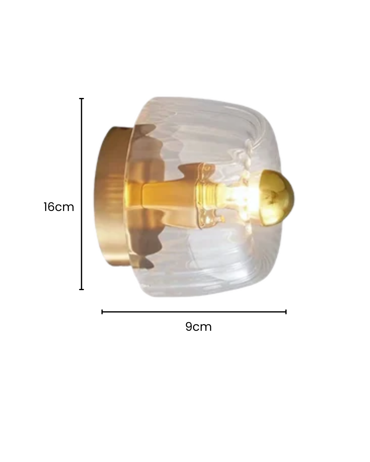 Förvandla ditt utrymme med det eteriska skenet från La Lueur Radieuse, en slående skandinaviskinspirerad lampa som bländar både som vägg- och takarmatur. Lampan är designad med en ribbad kristallklar glasskärm och kombinerad med en gyllene eller silverfärgad metallbas, och ger ett fascinerande radiellt ljusmönster - som en solstråle i miniatyr på din vägg.