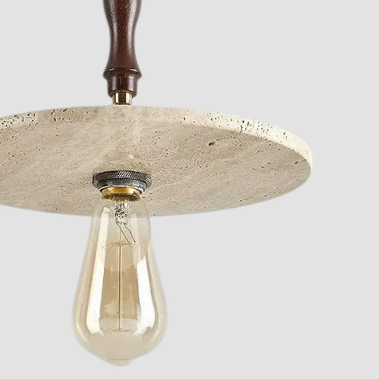 Taklampa i travertin och trä med exponerad glödlampa - hantverksinspirerad design